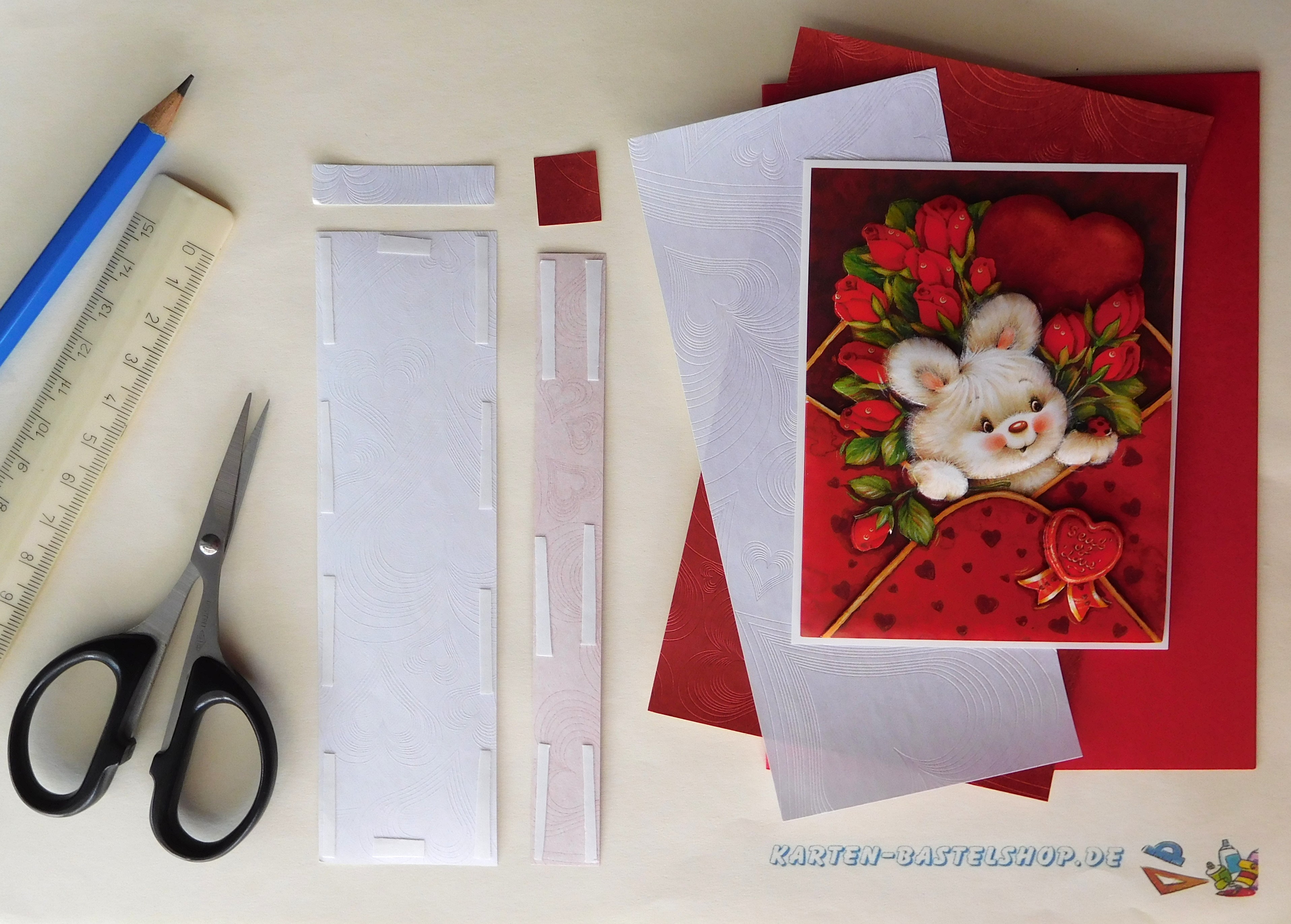 Für diese Karte verwenden wir eine rote A6-Doppelkarte mit Umschlag, das 3D-Motiv mit einem Bären, Rosen und Herz im Umschlag, Bastelpapier „Herzen“ in Weiß und Dunkelrot, den silbernen Stickerbogen JeJe Nr. 2618 „Viel Glück“, den Stickerbogen Starform Nr. 406 „von Herzen“ sowie silberne Strasssteine in Herzform.