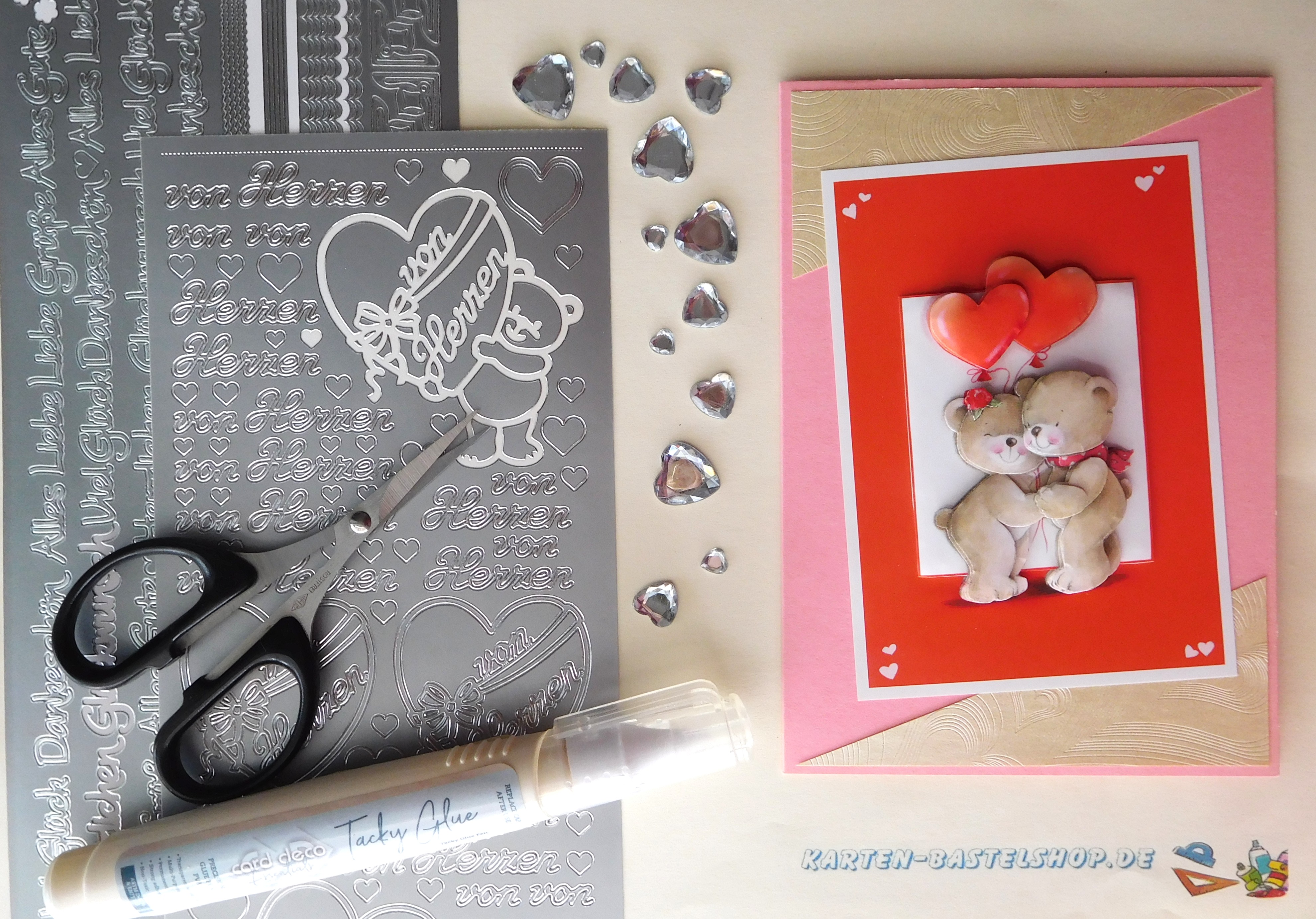 Für diese Karte verwenden wir eine rosa A6-Doppelkarte mit Umschlag, das 3D-Motiv mit zwei Bären und Herz-Luftballons, Bastelpapier „Herzen“ in Elfenbein, den silbernen Stickerbogen JeJe Nr. 2618 „Viel Glück“, den Stickerbogen Starform Nr. 406 „von Herzen“ sowie silberne Strasssteine in Herzform.