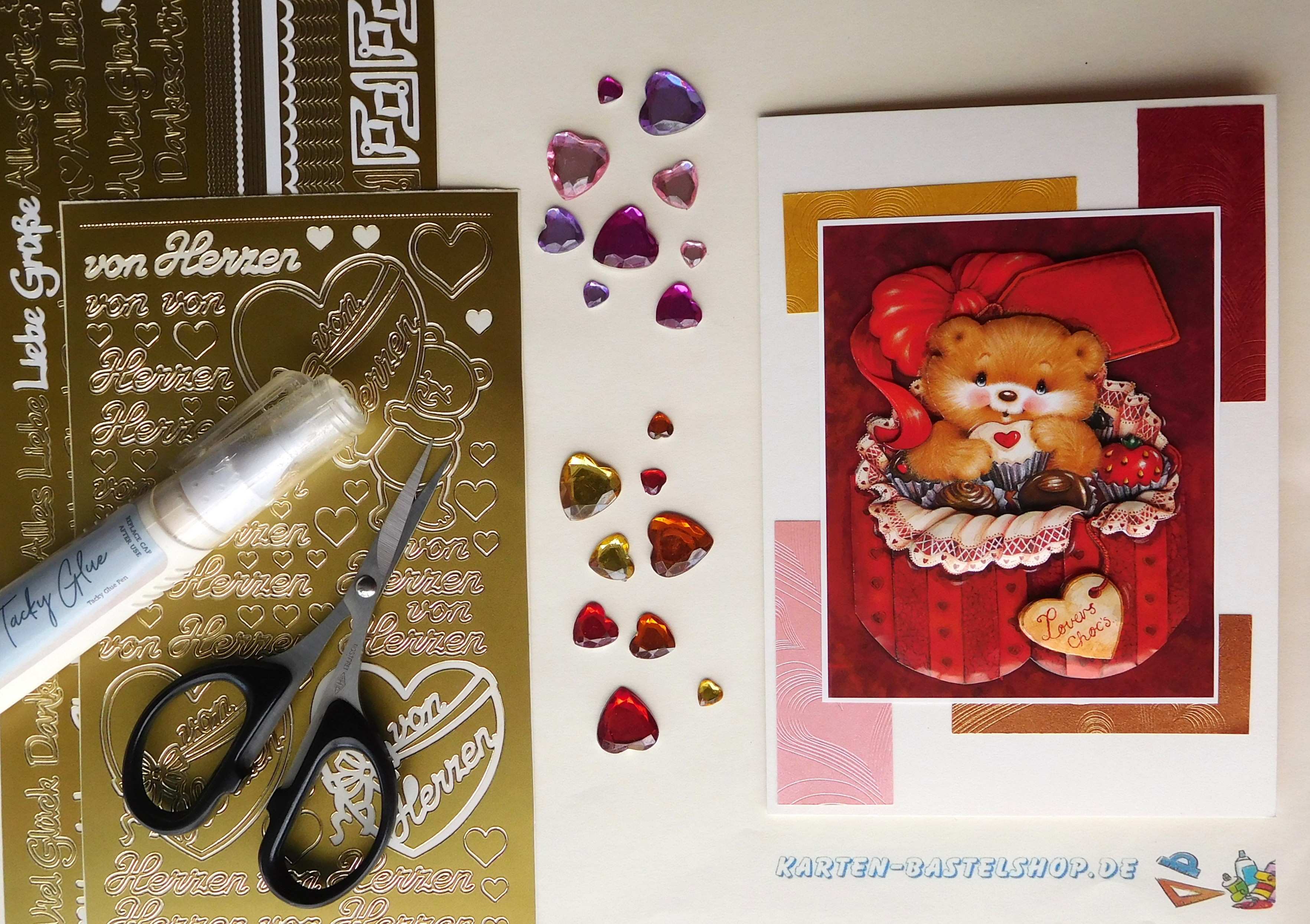 Für diese Karte verwenden wir eine elfenbeinfarbene A6-Doppelkarte mit Umschlag, das 3D-Motiv mit einem Bären in einer Pralinen-Herzdose, Bastelpapier „Herzen“ in Rosa, Gelbgold, Bronze und Dunkelrot, den goldenen Stickerbogen JeJe Nr. 2618 „Viel Glück“, den Stickerbogen Starform Nr. 406 „von Herzen“ sowie Strasssteine in Herzform in Rot-, Gelb- und Flieder-/Pinktönen.