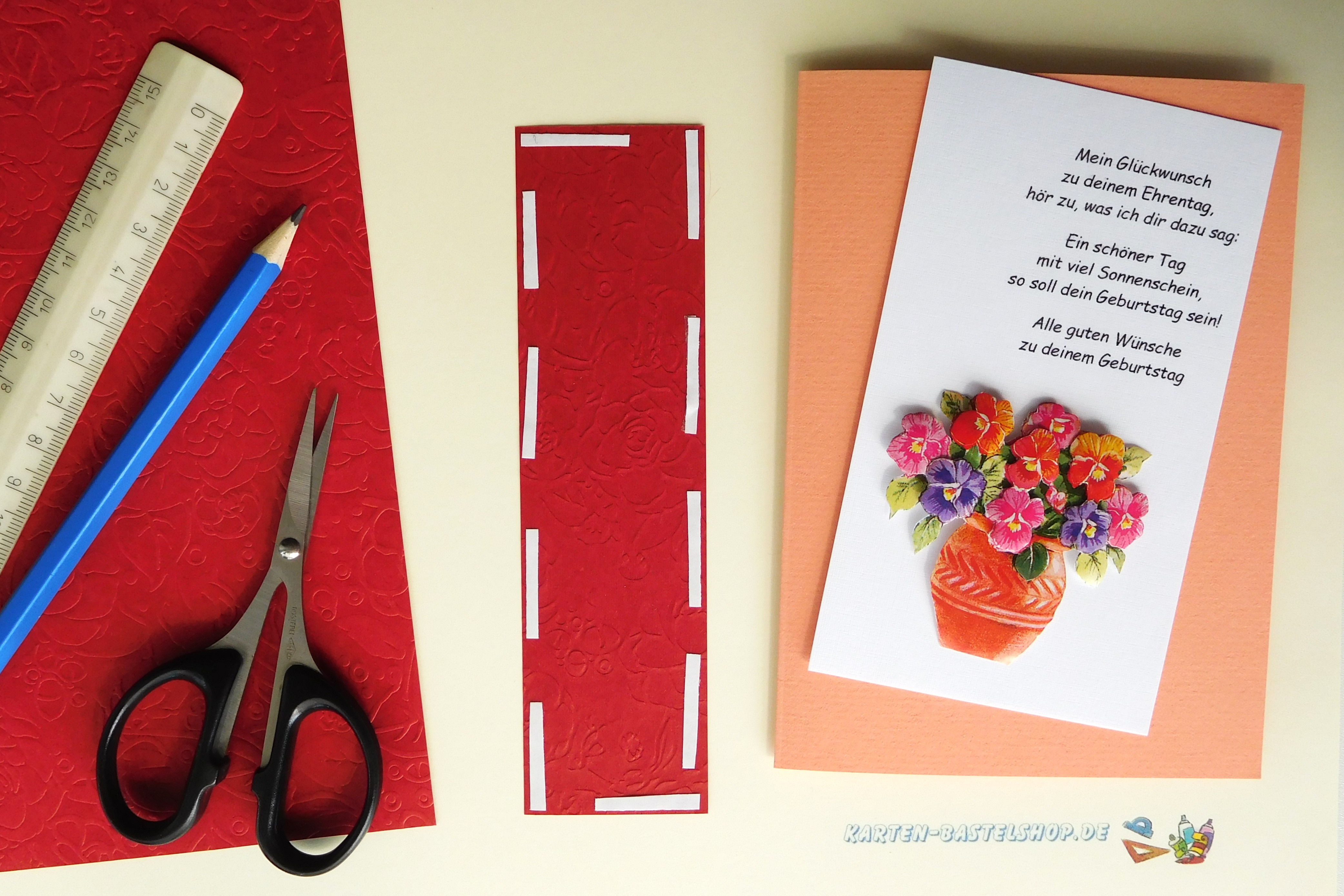 Zuerst schneiden wir aus dem roten Bastelpapier einen Streifen mit einer Größe von 4 cm × 14,7 cm zu.