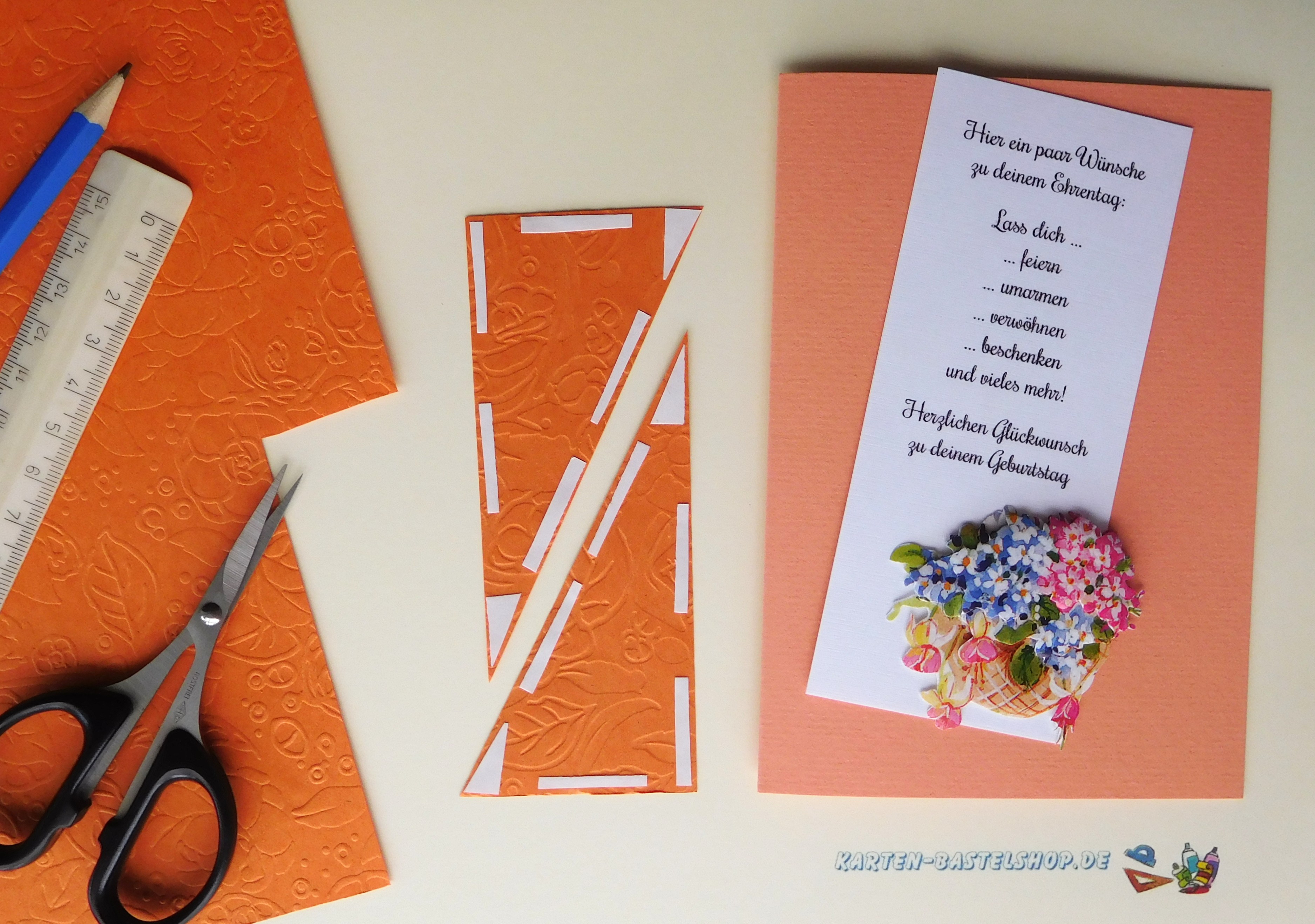 Die freie Ecke des Kartenauflegers wird mit einer geraden Bordüre in Orange eingefasst. Zusätzlich wird eine ca. 9 cm lange Bordüre außen neben dem Kartenaufleger aufgeklebt.