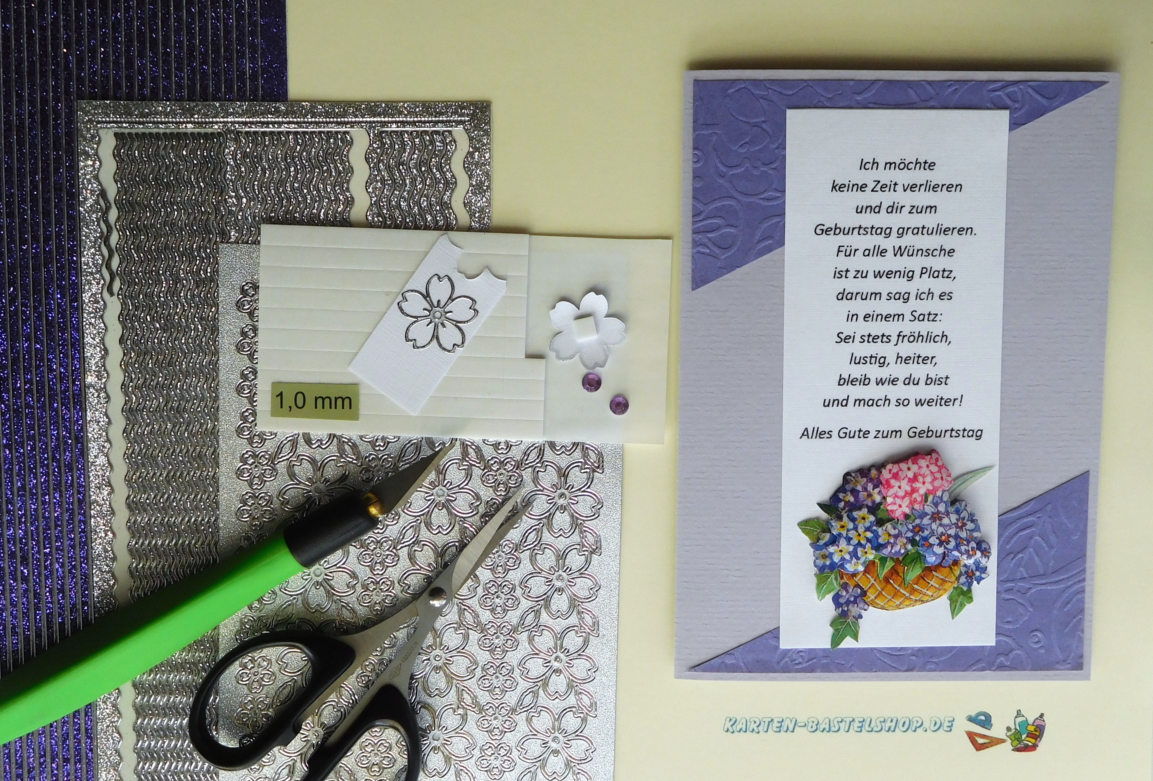 Die freie Ecke des Kartenauflegers wird mit einer geraden Bordüre in Lila eingefasst. Zusätzlich wird eine ca. 9 cm lange Bordüre außen neben dem Kartenaufleger aufgeklebt.